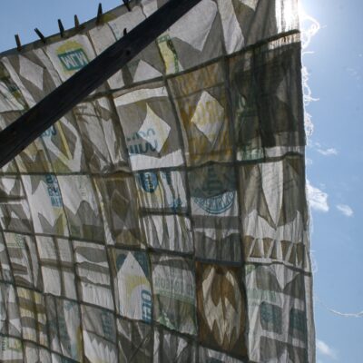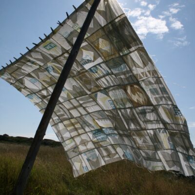 The blanket first flew in St. John’s and most recently in Tilting, during Pam’s recent residency there. There, for the first time, it served as a screen to reveal the fish flying in the meadow of the Reardon House.