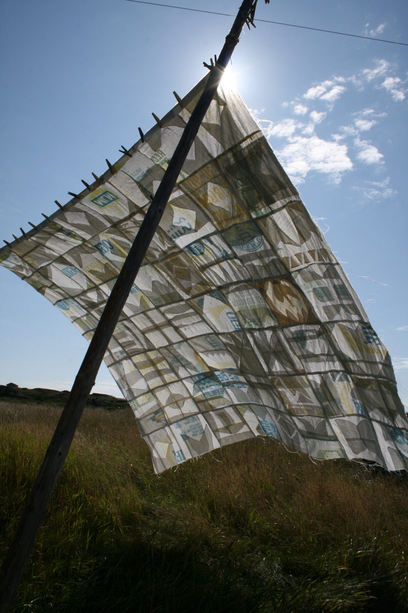 In We Wear Our History on Our Skin, the blanket performs as a projection screen for a 10-minute looped video of those fish flying on site in Port Rexton, Bonavista Bay and in Titling, Fogo Island. It is the first of the Memory Blankets.