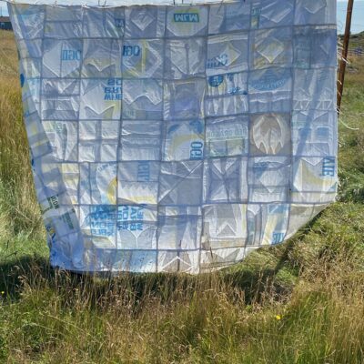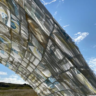 The Fish Blanket was constructed after weeks of unmaking during the first months of the pandemic. It is made from the “skins” of those fish that flew by the North Atlantic… calling up memory of abundance and of women’s labour. Picked apart stitch by stitch, each fish was eventually sewn into a square and were pieced together to form what was intended to carry both past and future… a reminder of the fish that used to be and a projection screen for those that would fly again. As a blanket it claimed its own life on the line… flying in the North Atlantic winds.
