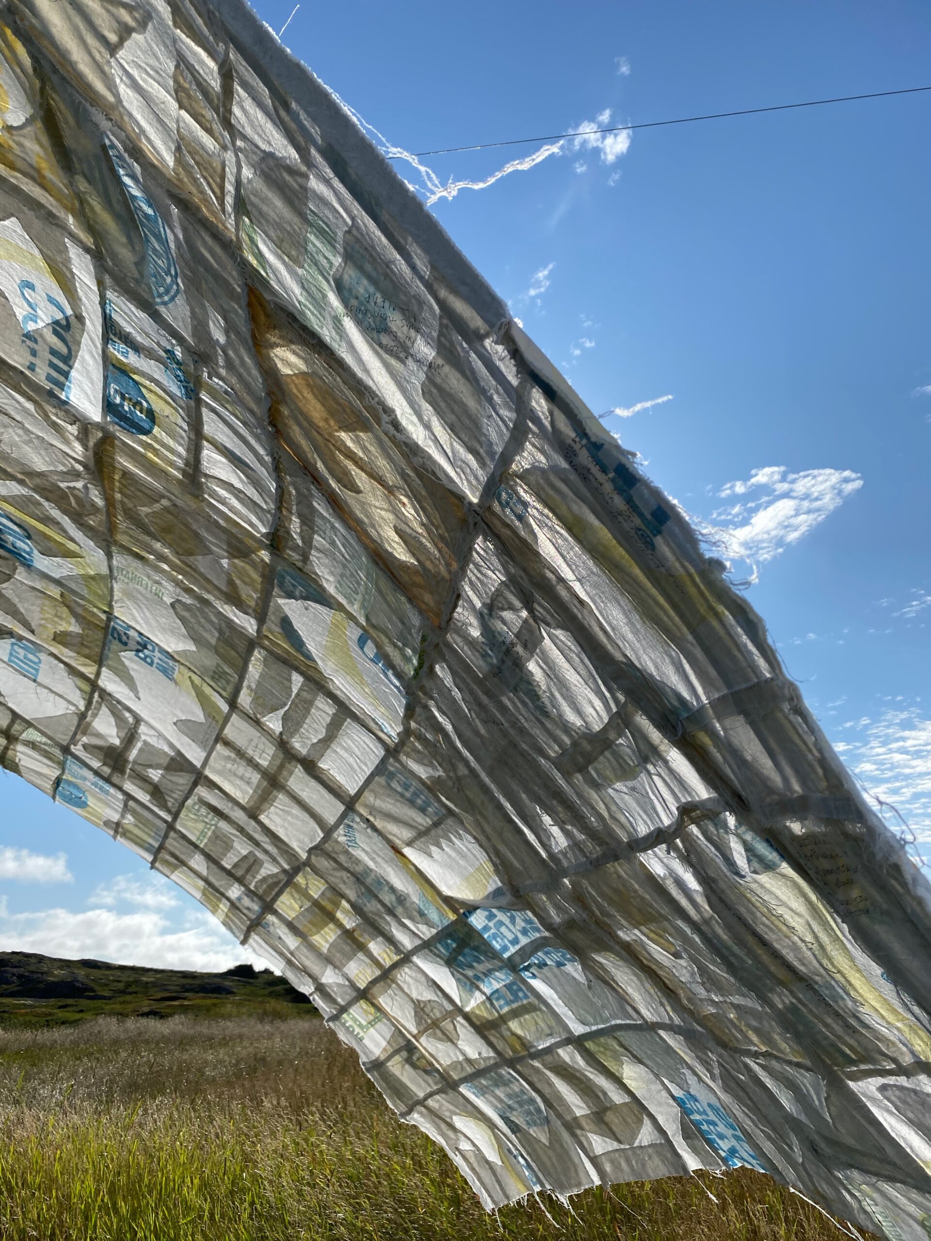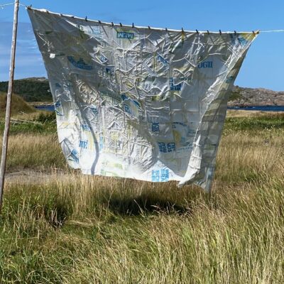 Making fish is an old Newfoundland tradition primarily undertaken by outport settler women who salted and dried the codfish that were harvested by inshore fishers. Some women were legendary for how good their fish was and before refrigeration, salt cod was the primary method for preserving this important protein for use and for market. The Fish Blanket emerged from the twenty-five year installation projects Re-Seeding the Dream (1997-98), Reseeding the Dream East(2017), and 30 Days in Tilting(2021). This work, built from the artist’s making of fish-shaped wind socks that fly at various sites, marks and honours this female labour of making fish, at the same time as calling them back home after the devastation of the Cod Moratorium in 1992.