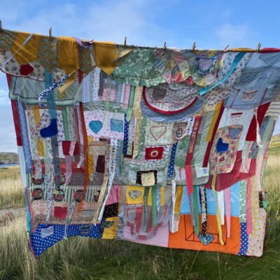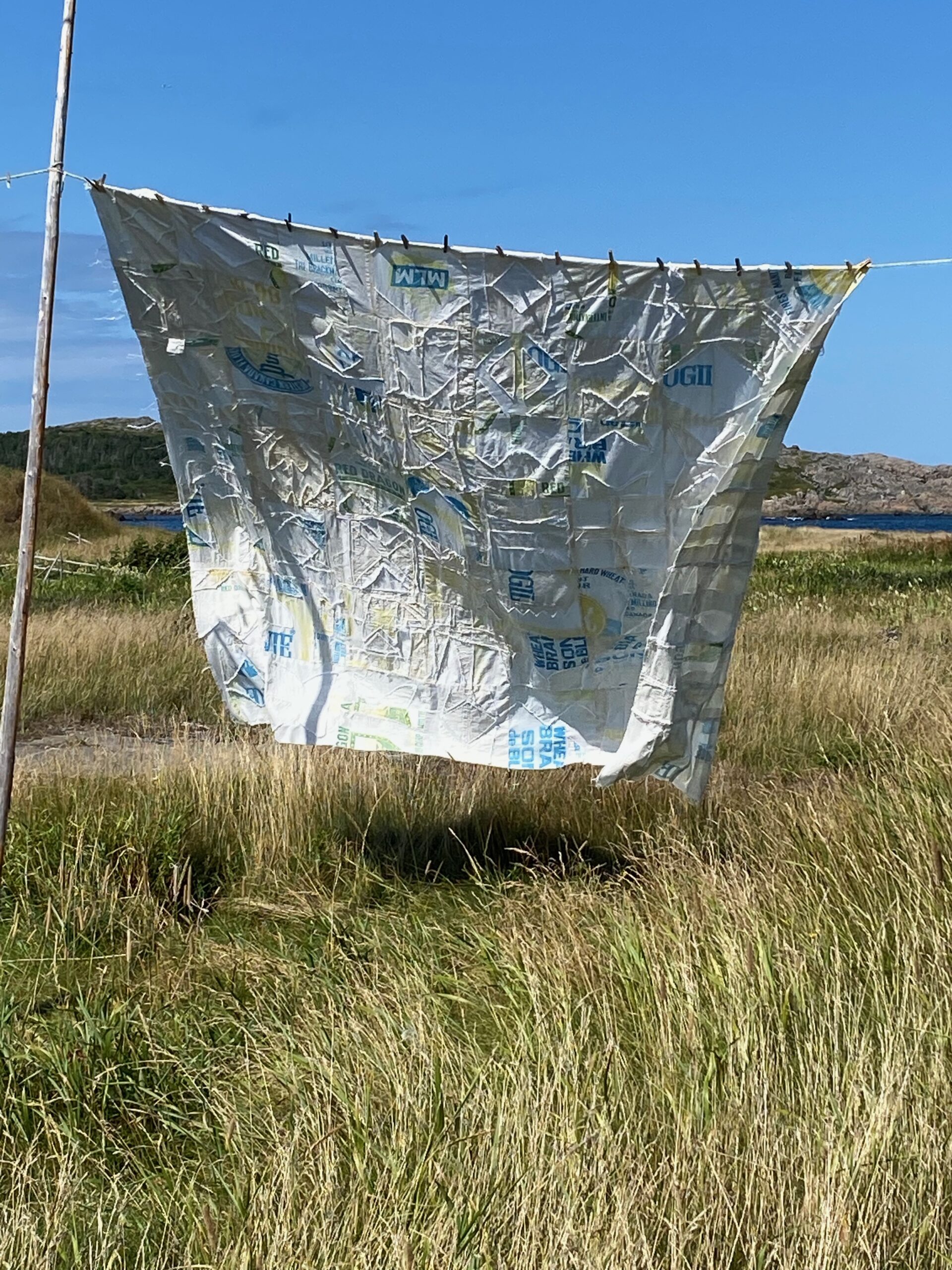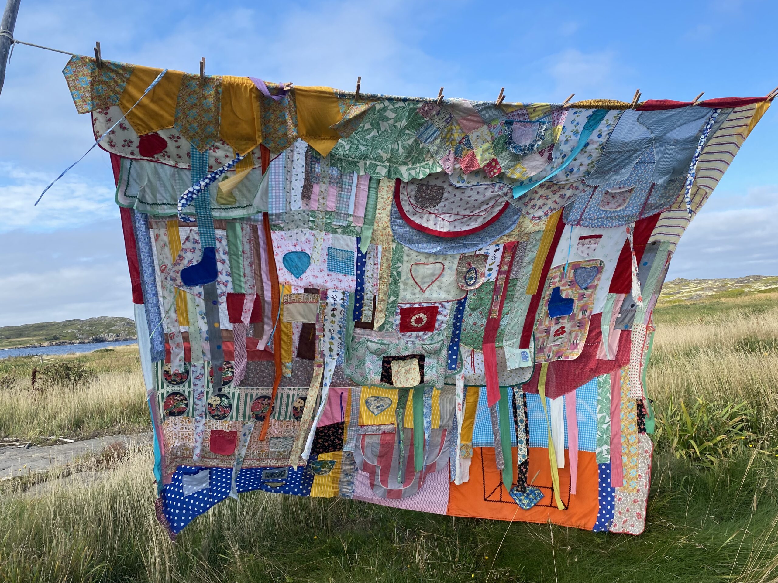 The blankets are performative on their own, but intended for wrapping and warming women with the memories of women’s work. The labour here is clear and sweet… echoes of the kitchen work these aprons tended to, of the work invested in making the apron, the artist’s work in unmaking and re-making , and also the laundry lines in the wind that are so emblematic of rural life. The wrapping and warming and story-work that will emerge have only just begun… taking the blankets on bodies out onto the land to dance without lines in the wind. Thanks here to Tanea Hynes for lending me her labour, her eyes and for being the body-in-the-blanket for the first live work at Salmon Cove beach and Grates Cove in 2021.